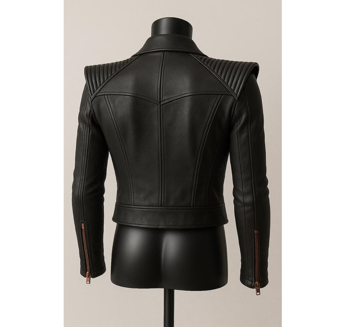 This striking cropped biker jacket is crafted from 100% genuine black leather, designed to make a bold statement. Featuring structured ribbed shoulder panels, wide lapels, and high-quality copper-tone zippers on the front, sleeves, and pockets, it exudes both elegance and attitude. The tailored fit accentuates the waist, while detailed seam work enhances the sculpted silhouette. Ideal for edgy streetwear or modern fashionistas looking to elevate their outerwear collection.