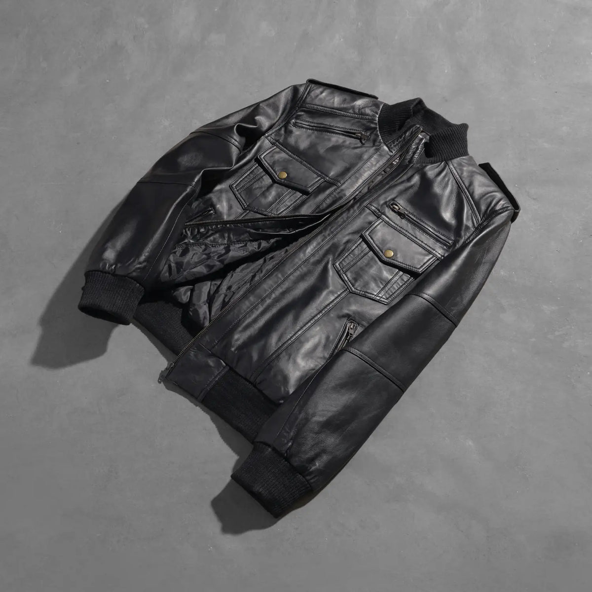 Agent Shadow Black Leather Bomber Jacket - XS (US 34)