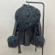 Step into high-fashion luxury with this bold and dramatic black leather coat, designed for those who love to make a statement. Featuring a voluminous curly faux fur shawl collar and oversized fur cuffs, this coat offers a perfect fusion of edgy leather and lavish texture. Its belted waist and double-breasted detailing add classic structure, while the lush trim brings undeniable glamour. Whether you're walking into a winter party or owning the city streets, this showstopper is your go-to for maximum impact and unmatched style.