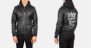 Bravado Black Hooded Leather Bomber Jacket with the following changes: