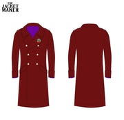 Jacket 1* Outer Shell: Synthetic wool fabric * Inner Shell: Polyester in purple color * Closure Style: Double-breasted buttoned * Collar Style: Lapels * Cuffs Style: Folded * Outside Pockets: 2 waist flap pockets * Inside Pockets: 2 inner lining pockets * Color: Red * Knee length * Embroidery on the left lapel * Mock# 266477-1