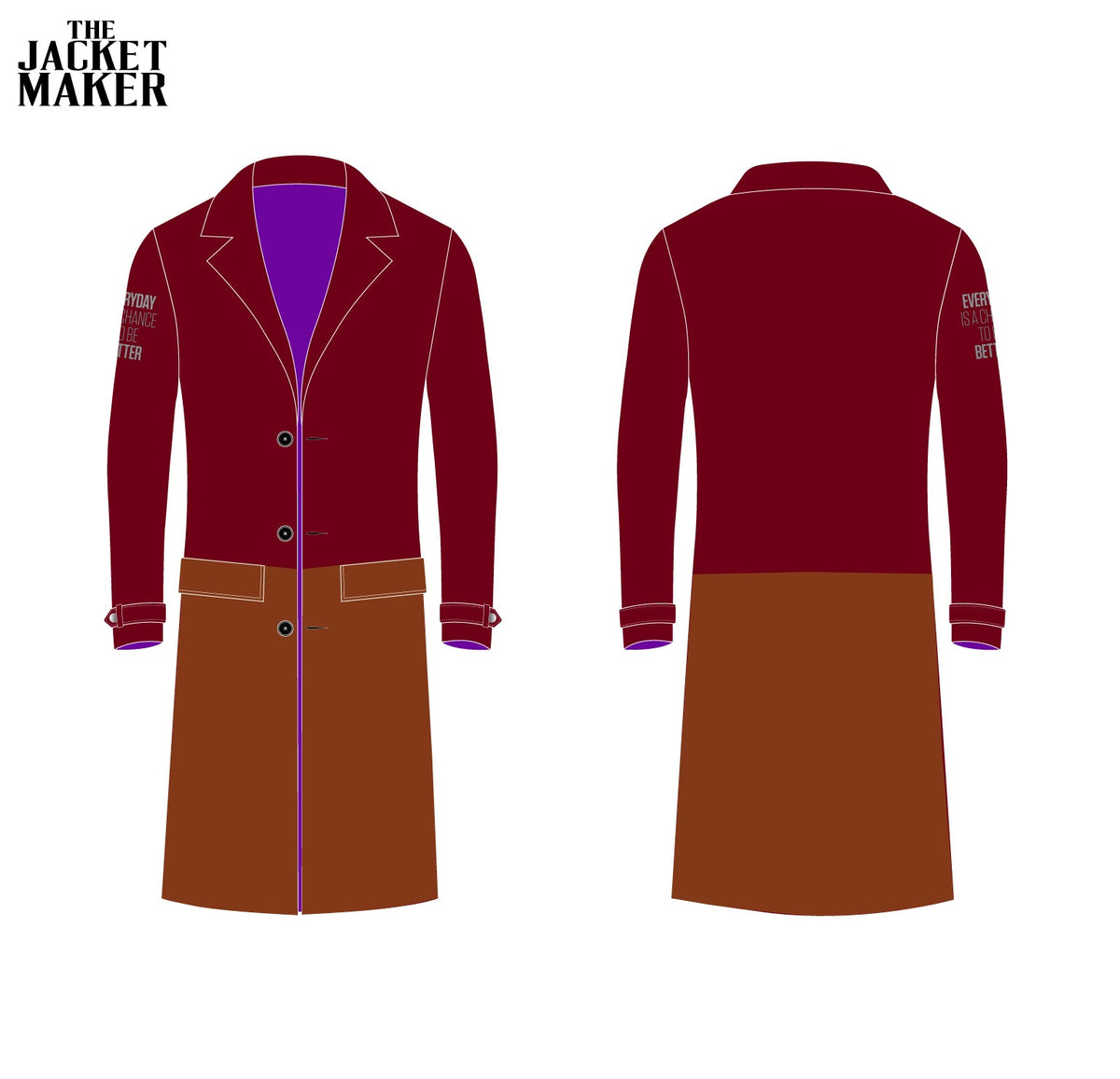 Jacket 5* Outer Shell: Synthetic wool fabric * Inner Shell: Polyester in purple color * Closure Style: Double breasted buttoned * Collar Style: Lapels * Cuffs Style: Open hem with adjustable strap * Outside Pockets: 2 waist welt pockets * Inside Pockets: 2 inner linnig pockets * Color: Purple * Knee length * Embroidery on left lapel * Mock# 266477-5