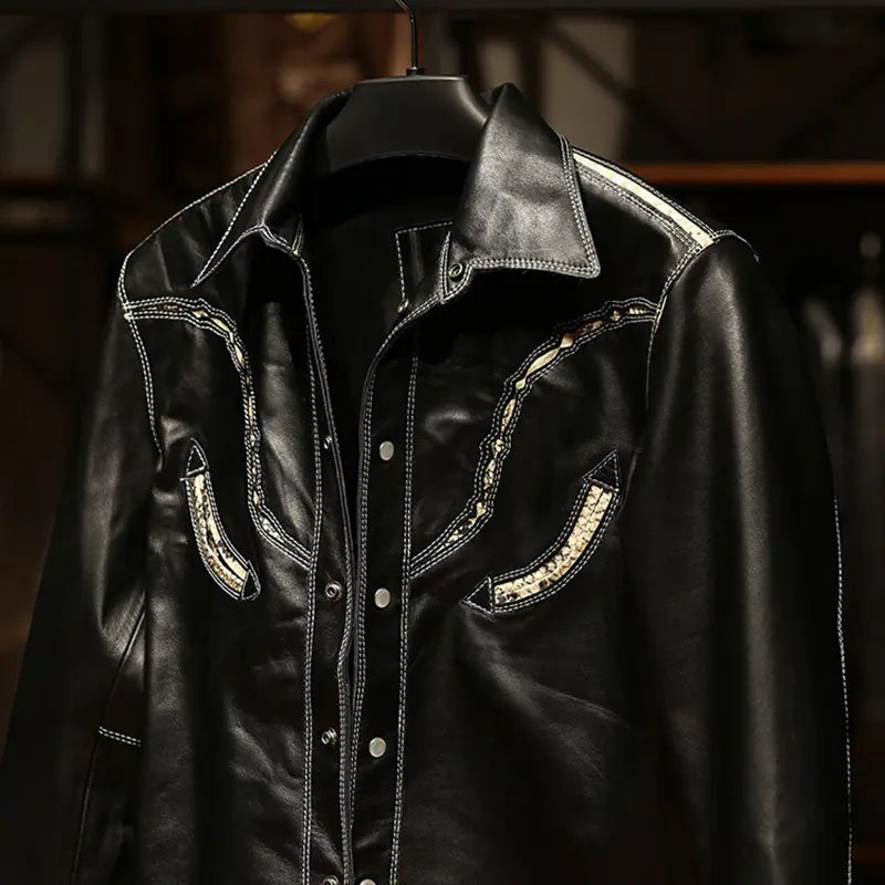 Add a bold Western edge to your wardrobe with this striking black leather shirt jacket. Designed with intricate embroidered detailing on the chest and shoulders, this piece blends rugged charm with sleek sophistication. The tailored fit, classic shirt collar, and snap-button front closure give it a structured, polished look that’s perfect for both casual and elevated occasions. Whether you're channeling rodeo vibes or city chic, this jacket brings the perfect balance of rebel attitude and timeless style.