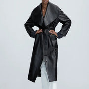 Unleash your inner sophistication with this striking black leather trench coat — a masterpiece in modern minimalism. Crafted with precision, this longline coat features a wide, dramatic shawl collar and a sleek belted waist that cinches for a flattering silhouette. Its structured yet fluid design moves with grace, offering a high-fashion edge to everyday wear. Whether you're walking into a business meeting or commanding attention during a night out, this coat levels up your wardrobe with power, poise, and undeniable elegance. It’s not just outerwear — it’s a statement.